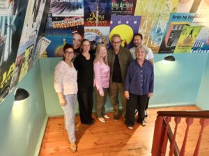 (på billedet – klik for at forstørre) Fra venstre mod højre: næstforperson Hannah Karina Mikkelsen, bestyrelsesmedlem Johanne Eggert, forperson Christina Krøll, bestyrelsesmedlem Christian Have, administrativ leder Lasse Frank og kunstnerisk leder Mie Brandt. På dagen, hvor billedet blev taget, måtte vi desværre undvære teatrets femte bestyrelsesmedlem Anne Skovmark